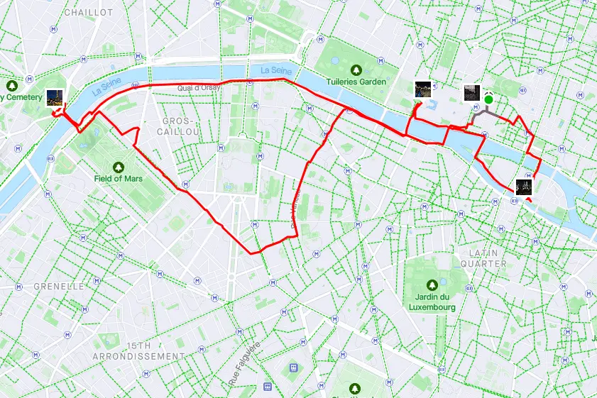 Nach einem Abendessen und einer Dusche fuhren wir dann einmal mit dem Rad vom Louvre zum Eifelturm zu Notre Dame und weiter durch die Stadt.