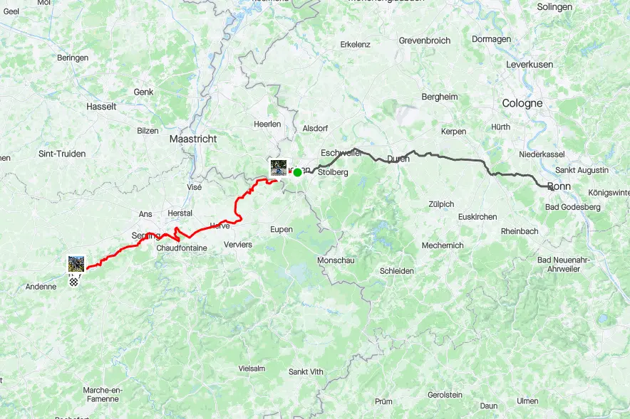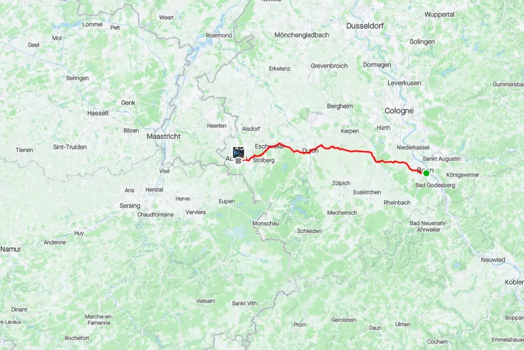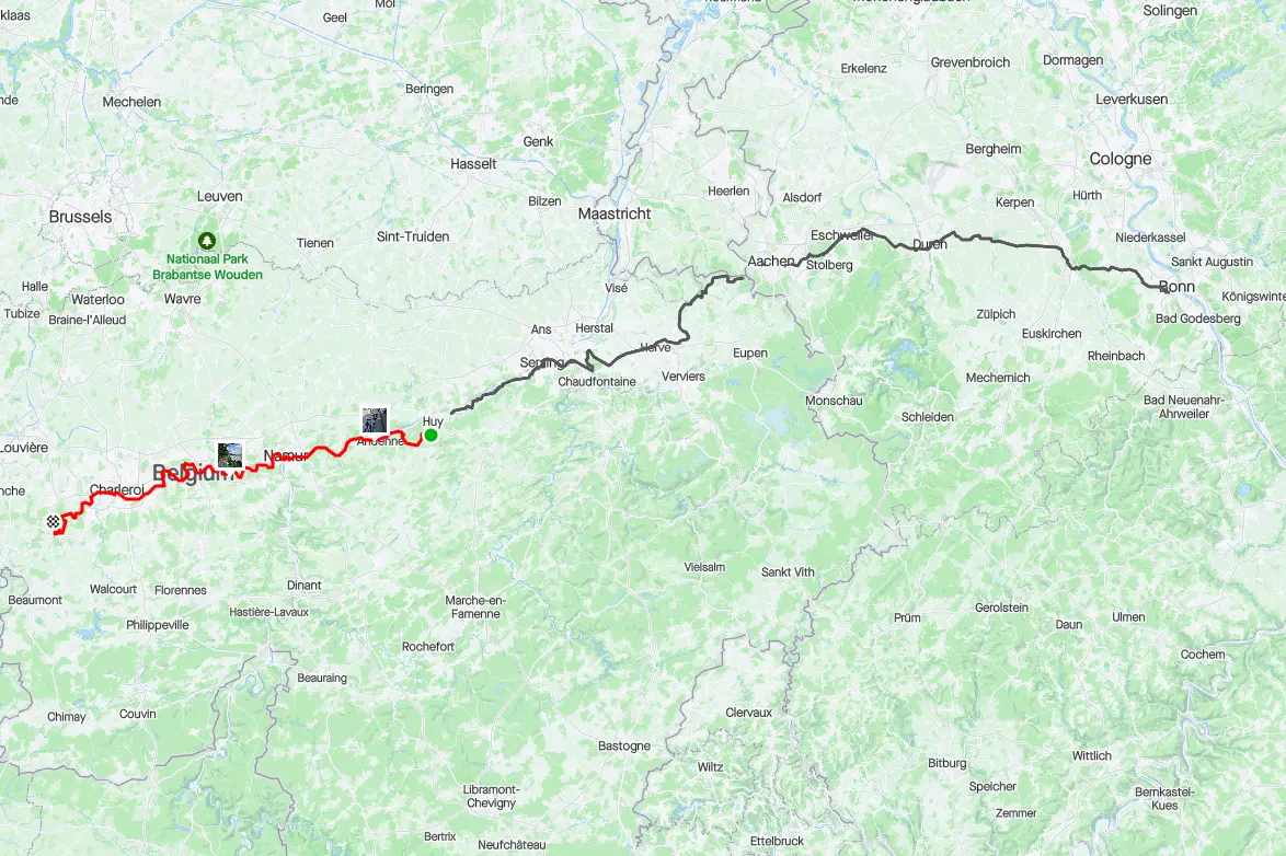 Nach einem Steilen Ausweg aus Aachen, am Dreiländereck vorbei, ging es sehr zügig auf sehr gut ausgebauten Radschnellstraßen durch die Landschaft. Dadurch verging die Strecke recht schnell bis wir abends in Huy eine lange, schlechte Straße mit 20% Steigung zur Unterkunft hoch mussten.
