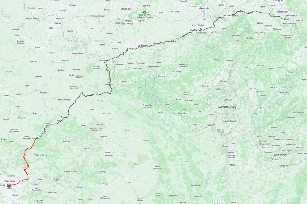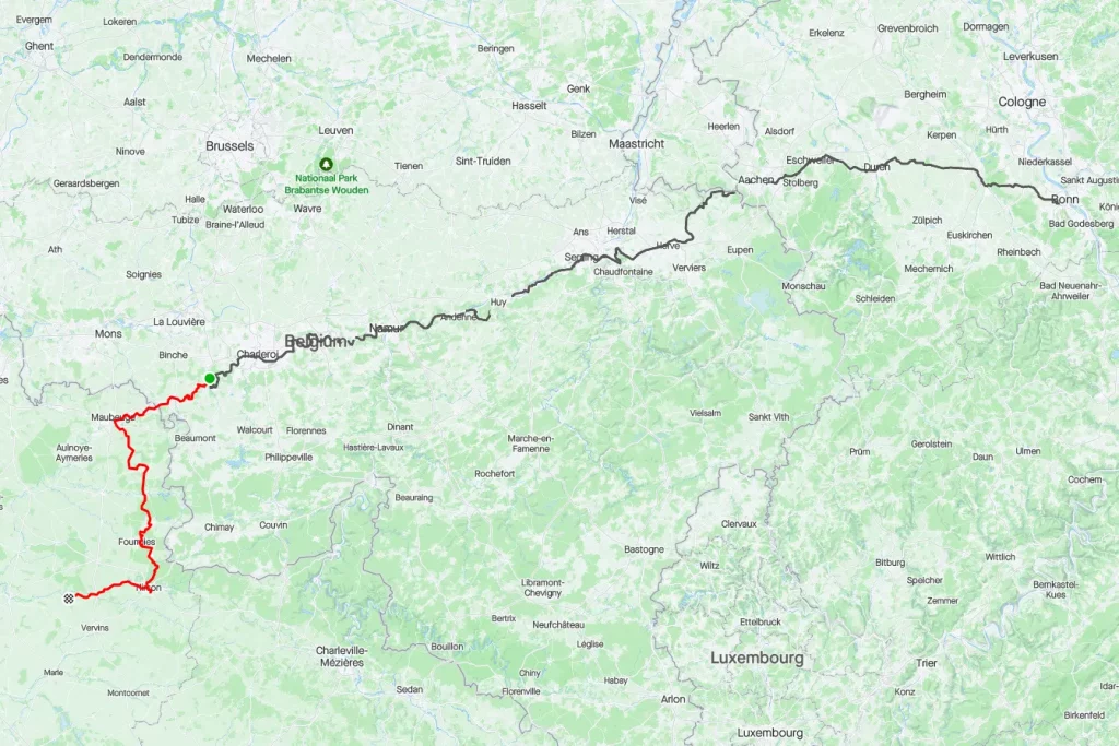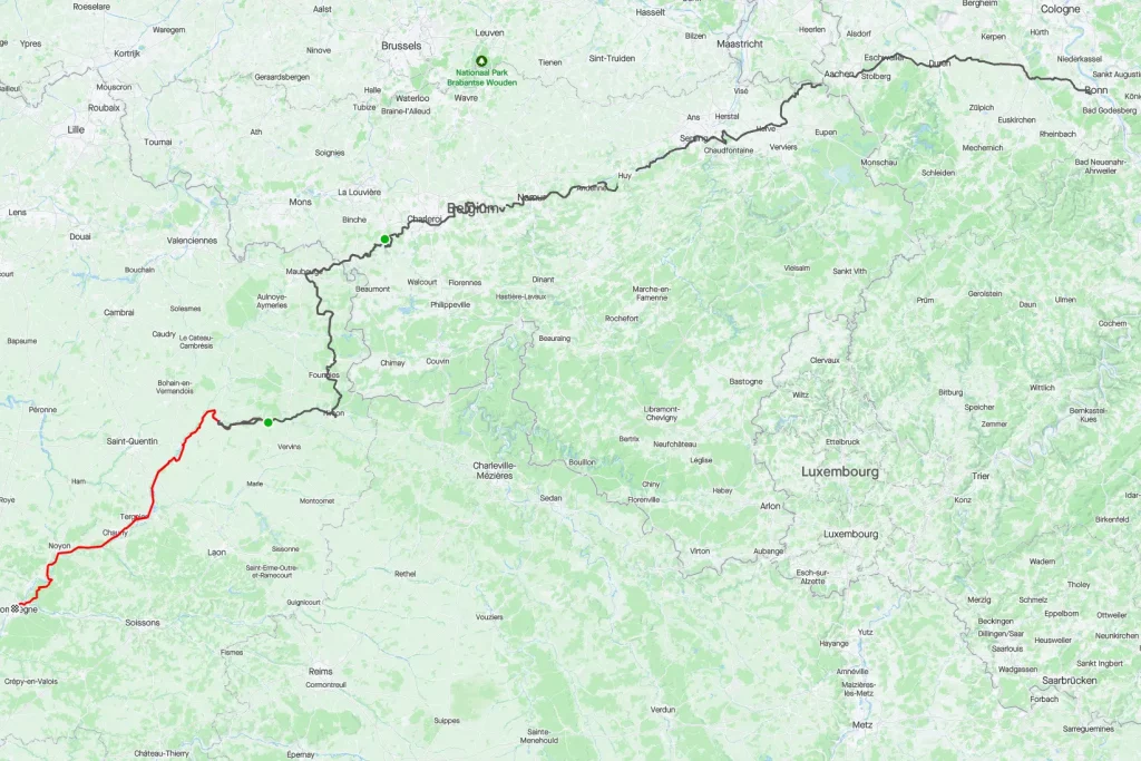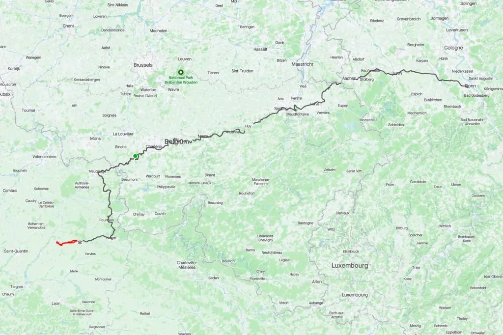 Tag 4 startete sehr angenehm. Nachdem wir den Weg aus Lobbes raus gefunden hatten, ging es gut erholt nach Maubeuge. Kurz vor der Stadt find jedoch starker Wind und Gewitter an. Nach einer kleinen Warte und Beratungspause unter einer Brücke, zogen wir alles an, was wir hatten und fuhren im Regen fort.